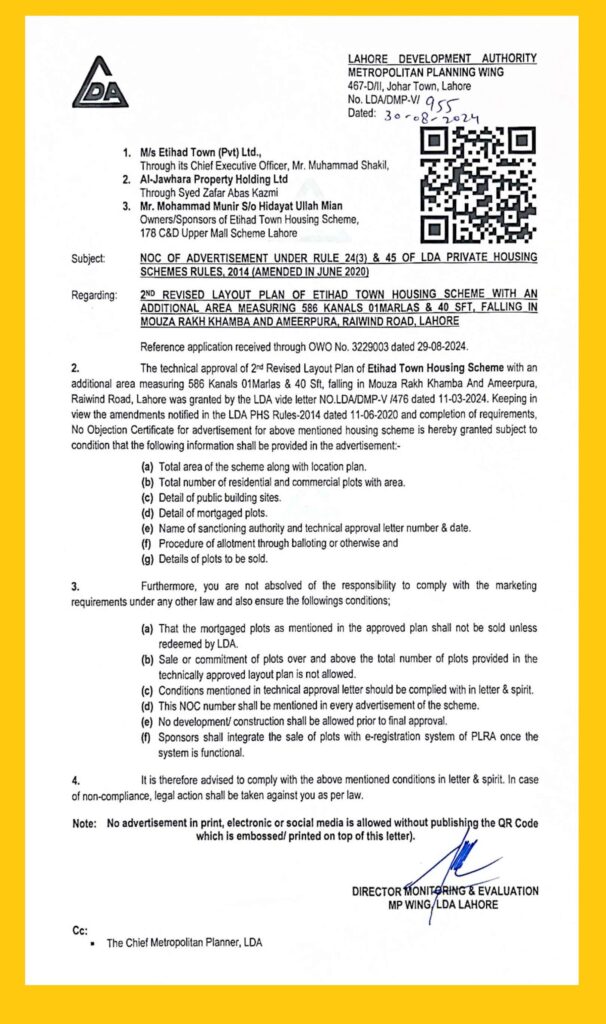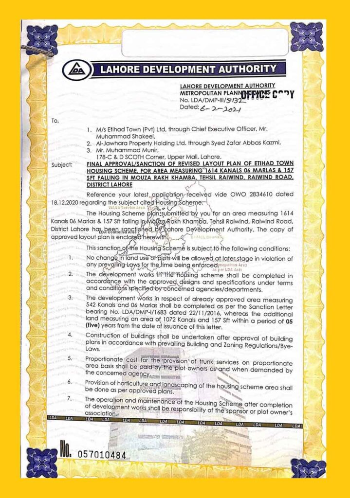 Etihad Town Phase-1 Lahore is a fully LDA-approved housing scheme spanning 2200.38 Kanals at Raiwind Road, Lahore, covering Mouza Rakh Khamba & Ameerpura. The project is finally approved with residential and commercial plots across Blocks A, B, C, D, E, F, G, H, J, Royal Enclave-I, and Royal Enclave-II. It offers 2390 residential plots and 748 commercial plots, with some plots mortgaged as per LDA regulations. Etihad Town ensures legal security, modern planning, and premium location for investment and living.